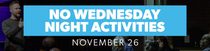 There will be no Wednesday night activities this Wednesday, November 26. We hope you enjoy this time with your family and friends, and we’ll see you the following week!