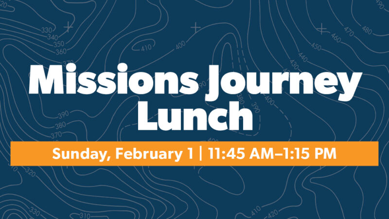 Join us on Sunday, February 1, from 11:45 a.m.–1:15 p.m. in the Fellowship Hall for a Mission Journey Lunch. Enjoy lunch with Ian Price (Missions Minister at Harpeth Heights) and Keith Holloway (Missions Mobilization Minister Brentwood) as you learn more about upcoming mission journeys and discover how you can be involved in what God is doing locally and globally.